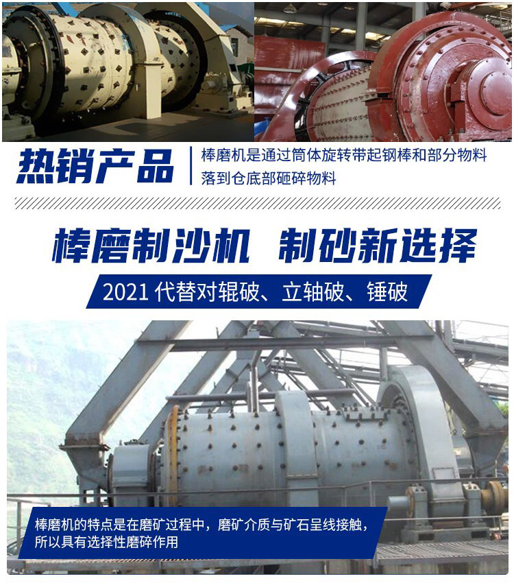 二、出料均勻產(chǎn)量高——采用先進(jìn)的可控進(jìn)出料棒磨機(jī)技術(shù),結(jié)合實(shí)際用戶的研磨物料配用合適的研磨體,一改傳統(tǒng)球磨機(jī)的面接觸為線接觸,使制砂機(jī)的出料粒度更為均勻、產(chǎn)量更高, 適用于不同硬度(莫氏硬度 5.5 ~ 12 )的礦石。